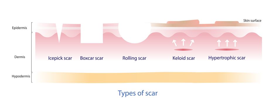 Boxcar acne scars: A boxcar scar is described as an indent with sharper edges. When the edges penetrate the flesh deeply it results in deeper scars. These types of scars can be found in the lower chest and jaw of your face.